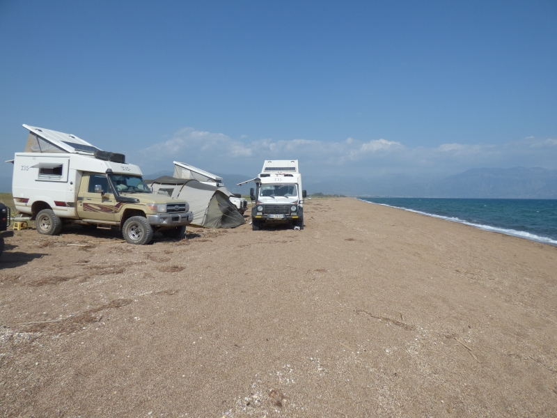 Cela fait,escortés par Jean-Louis et Thierry, nous rejoignons à petite vitesse et en évitant toutes les imperfections de la route, un camping en bord de mer, juste à côté de Patras où nous arrivons vers 19h30.
