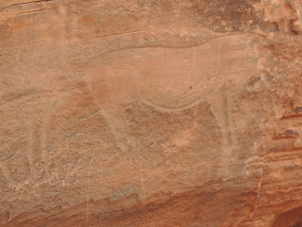 En poursuivant la piste, nous nous déroutons pour aller voir des gravures rupestres laissées par nos lointains ancêtres dans un petit massif de roches rouges au milieu de la plaine sableuse.