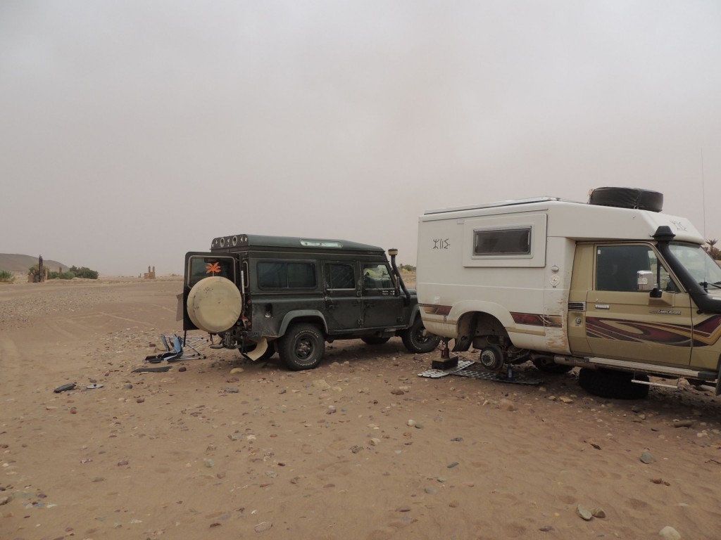 En fin de matinée, Guy casse son pont AR : il nous faut sortir de l’erg au mieux et nous décidons de rebrousser chemin après avoir démonté les 2 arbres de roues et l’arbre de transmission AR pour faire du 4×4 de Guy, une…. traction avant.