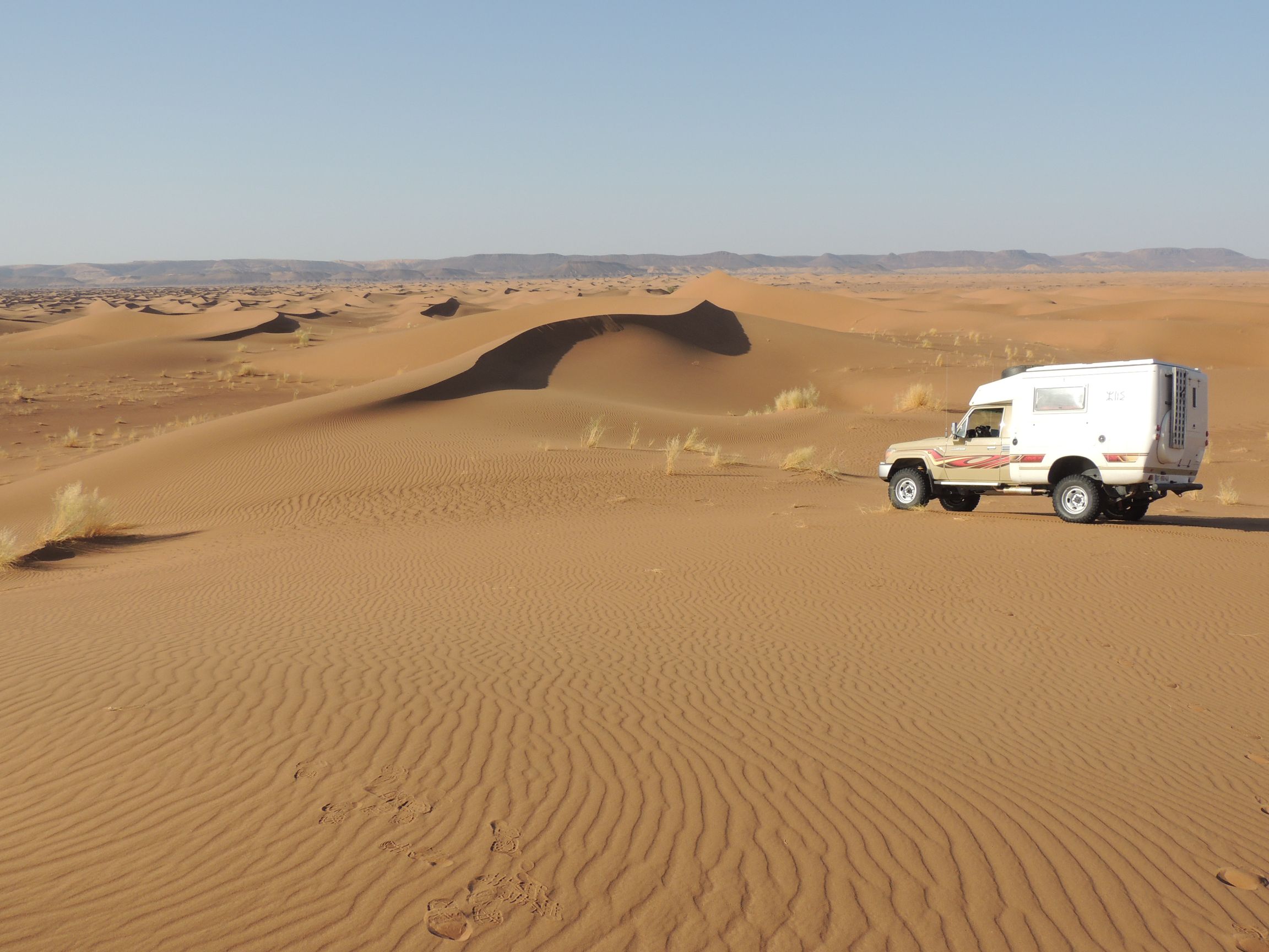 Après quelques aller et retour car le sable est très mou, nous renonçons à la trace directe dans l’erg pour contourner le massif et pénétrer un peu plus loin au cœur des dunes où nous établissons un magnifique bivouac .